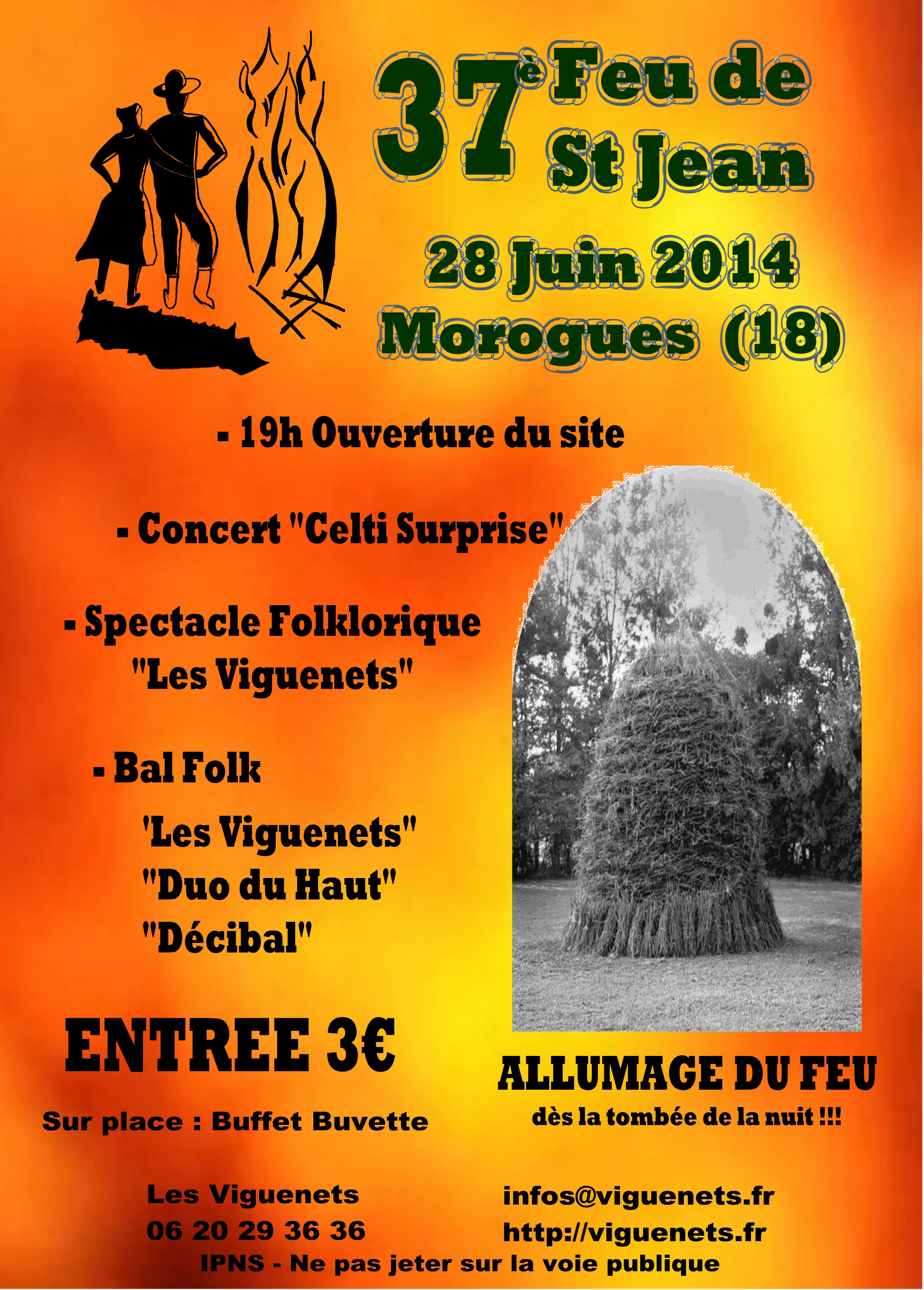 Programmation : 19h00 : Ouverture du site avec Buffet et Buvette Concert "Celti Surprise" Spectacle Folklorique "Les Viguenets" Bal Folk avec les groupe : "Les Viguenets" "Duo du Haut" "Decibal" ALLUMAGF DU FEU DES LA TOMBEE DE LA NUIT !!!