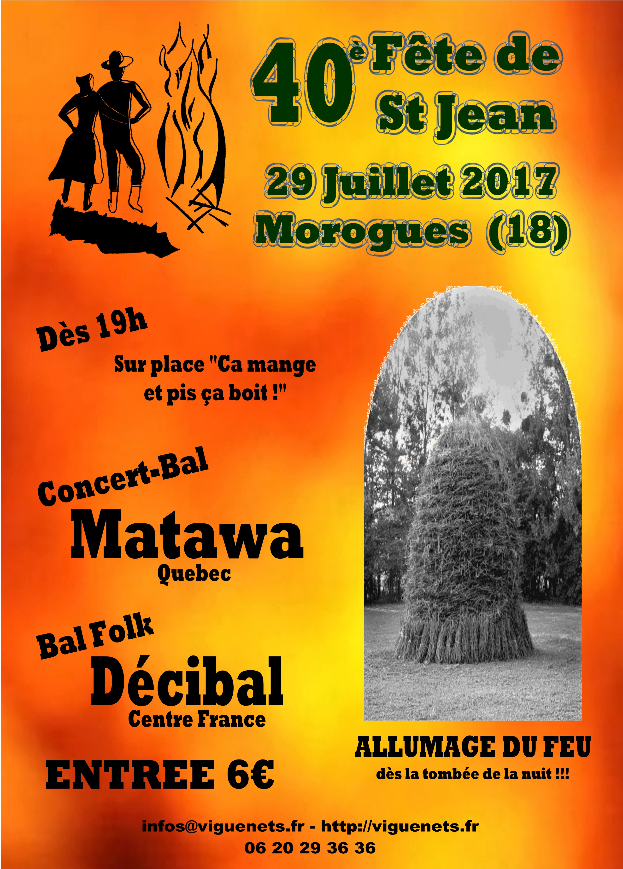Programme : 19h00 : Ouverture du site avec Buffet et Buvette Grand Bal Folk avec les groupes : "Matawa" Concert Bal Quebec "Décibal" Bal Folk Centre France ALLUMAGF DU FEU DES LA TOMBEE DE LA NUIT !!!