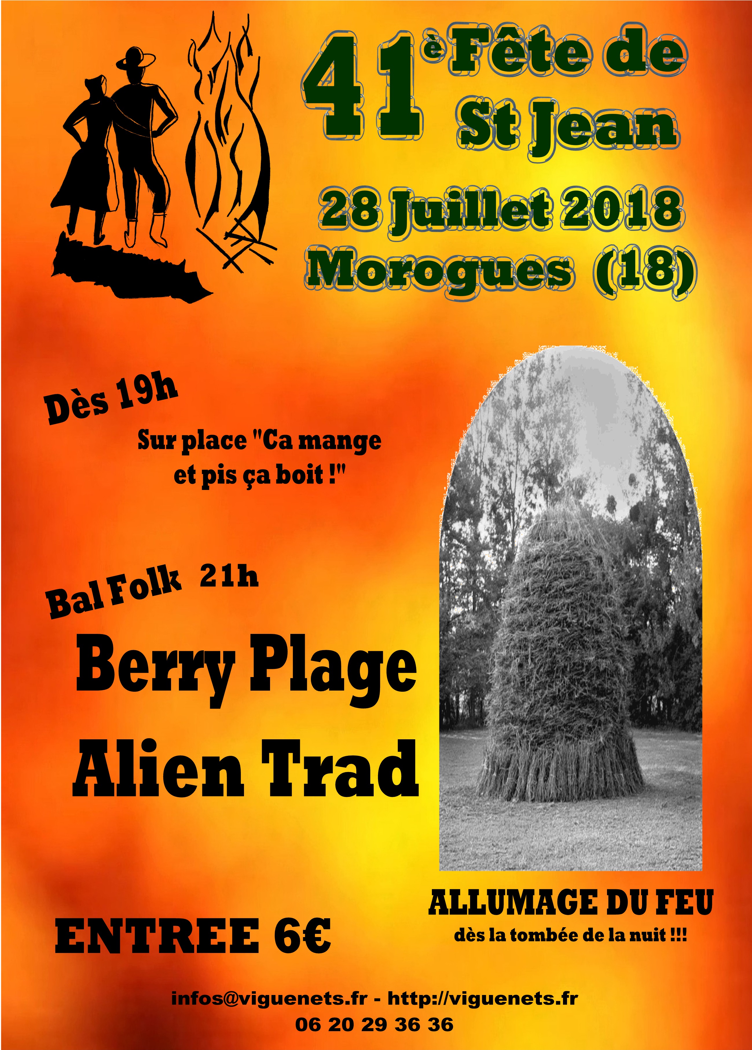 Programme : 19h00 : Ouverture du site avec Buffet et Buvette Grand Bal Folk avec les groupes : "Berry Plage" Bal Centre France "Alien Trad" Bal Folk Centre France ALLUMAGF DU FEU DES LA TOMBEE DE LA NUIT !!! Présentation des groupes : Berry Plage Berry plage ! Tout est dit : Du soleil, du Berry et de la Bourrée ! Bref, un enchantement de musiques de notre territoire arrangées et interprétées par trois authentiques berrichons ! Vielle à roue, Accordéon, Flûte traversière, chant... et de la patate du début à la fin ! … pas le temps de se reposer, on danse, on danse, on danse... Et que ça saute !